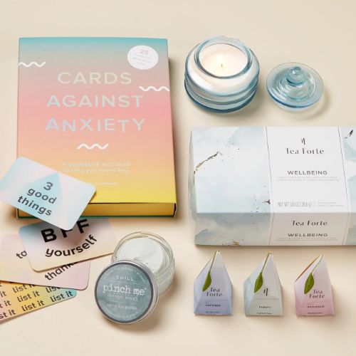 This gift set is packed with supplies that can help beat anxiety and stress. It comes with Cards Against Anxiety, a set of cards that helps teach cognitive behavioral therapy skills, a sampler of ten tea infusers, a sea salt candle, and therapy dough.